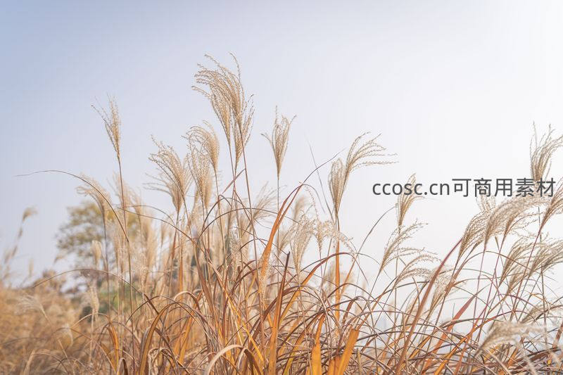 在温暖阳光照耀下,金黄色的芒草穗随风飘扬,传递着秋天独有的丰盈与宁静气息。