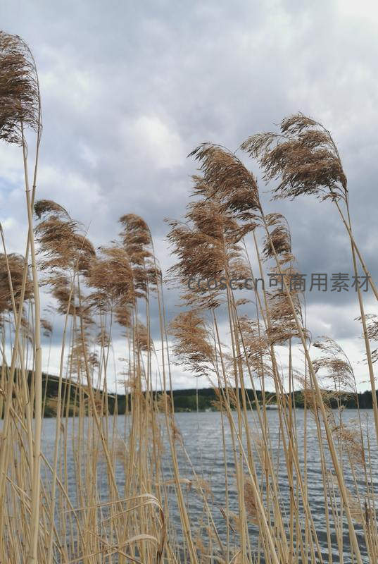 金黄的芦苇在湖边随风轻舞,灰蓝色的天空云层密布,远处山峦隐约,构成一幅静谧而诗意的自然画卷。