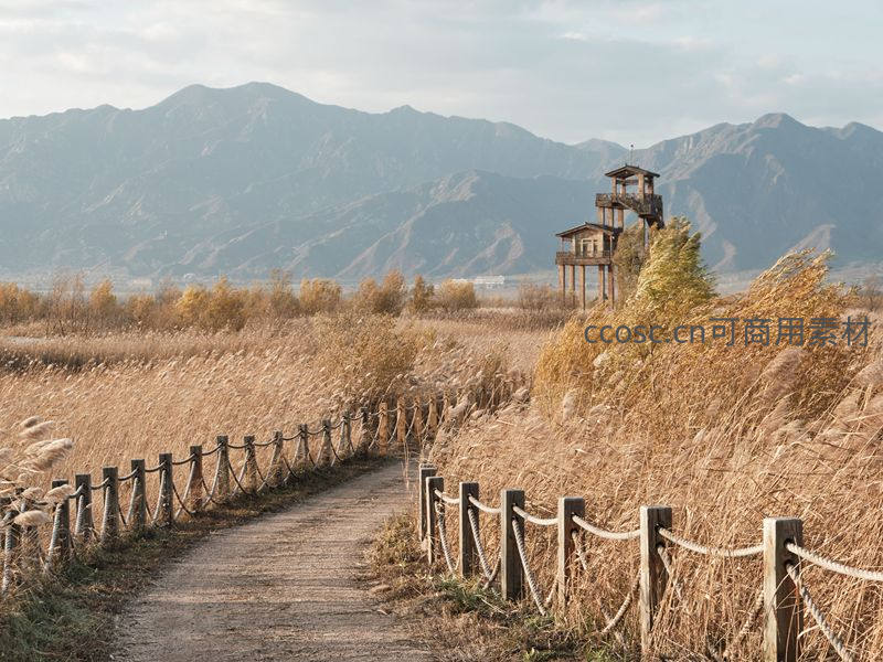 金黄的芦苇丛中,一条蜿蜒小径通向木质观景台,背景是连绵起伏的群山,构成一幅宁静祥和的秋日画卷。