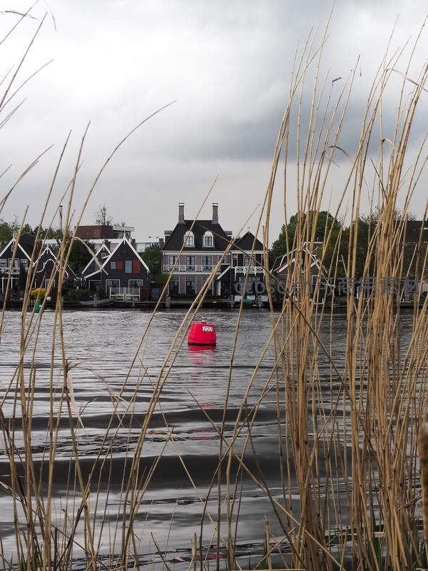 透过摇曳的芦苇丛,可见典型的荷兰风格房屋沿河而建,水中漂浮着一个醒目的红色浮标,展现了独特的水乡人文景观。