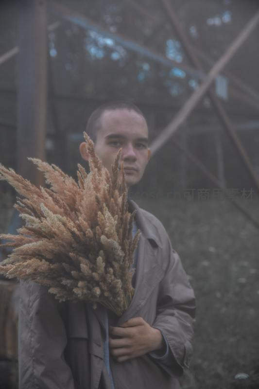 一位神情凝重的男子在薄雾笼罩的环境中,怀抱一束干枯的芦花,背景模糊的金属结构增添了一丝工业与自然交融的神秘感。