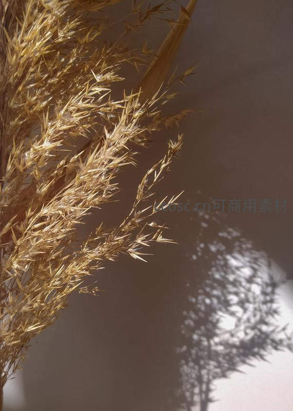 温暖的阳光斜射在干燥的芦苇穗上,纤细的枝叶投下清晰的影子,突显其精致的纹理与形态,营造出静谧而富有质感的画面。