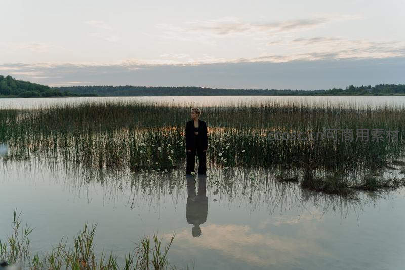 一位身着黑衣的人静静伫立在湖心的芦苇丛中,清澈的水面完美倒映出她的身影与天空,营造出一种超现实般的孤独与宁静之美。