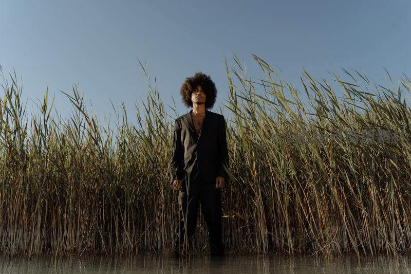 一位身穿黑色西装的卷发男子,静静伫立在高大的芦苇丛与浅水中,背景是纯净的蓝天,画面充满艺术感与宁静氛围。