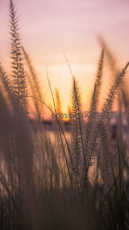 在粉紫色的日落天幕下,前景的草丛化为深色剪影,柔和的光线勾勒出其轮廓,营造出宁静、浪漫且富有诗意的自然景象。