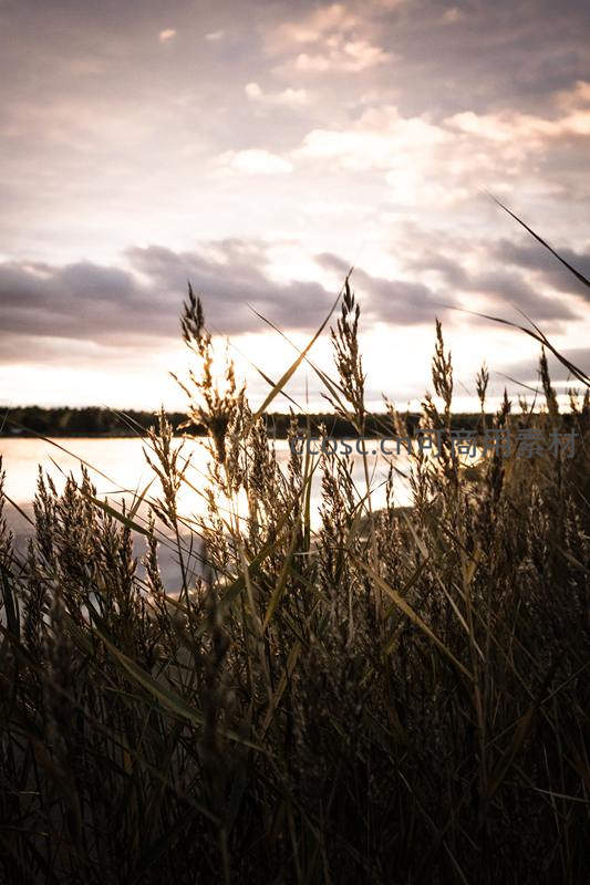 夕阳西下,湖面波光粼粼,前景芦苇被染成温暖剪影,与远处树线和云霞共同描绘出静谧黄昏。
