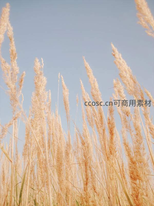 金黄色的芦苇在晴朗蓝天下随风轻舞,展现出秋季田野的宁静与诗意,是自然风光的绝佳写照。