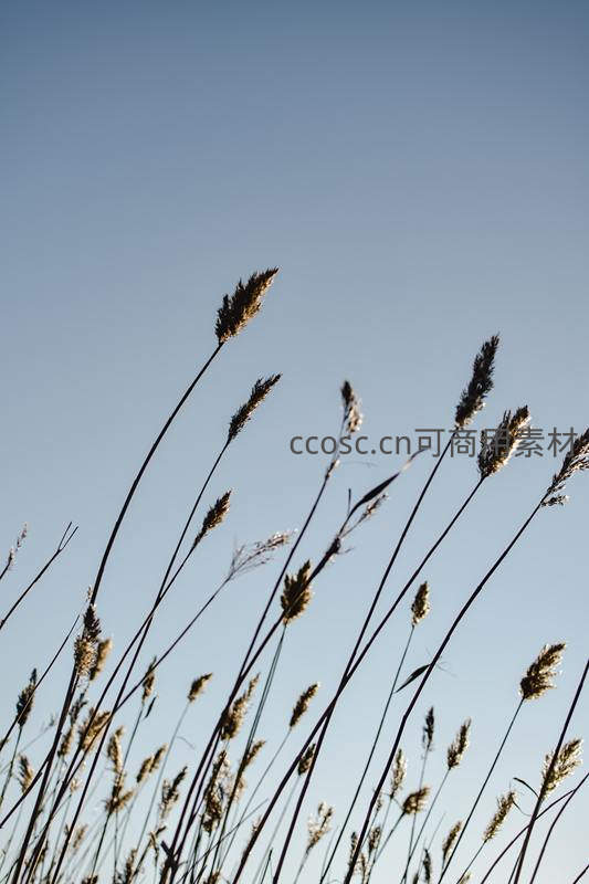 芦苇在逆光下形成优雅剪影,与纯净蓝天构成强烈对比,展现自然光影的艺术美感与宁静氛围。