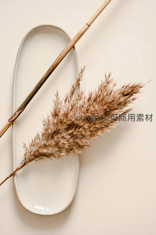 一束干枯的芦苇优雅地置于白色椭圆陶瓷盘上,背景纯净,展现极简主义的自然装饰风格。
