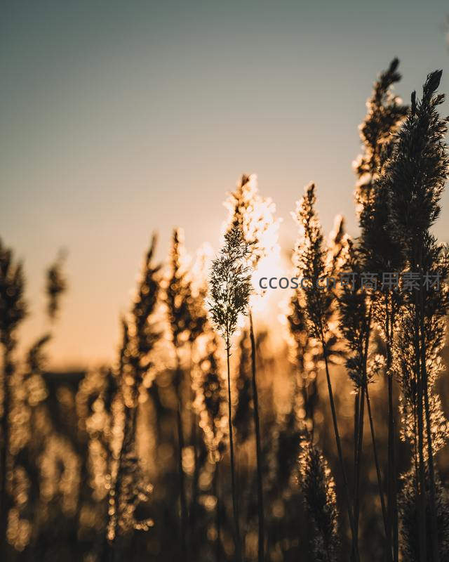 落日熔金,芦苇丛在逆光下化作深邃剪影,阳光穿透穗头洒下点点光斑,营造出温暖而梦幻的黄昏意境。
