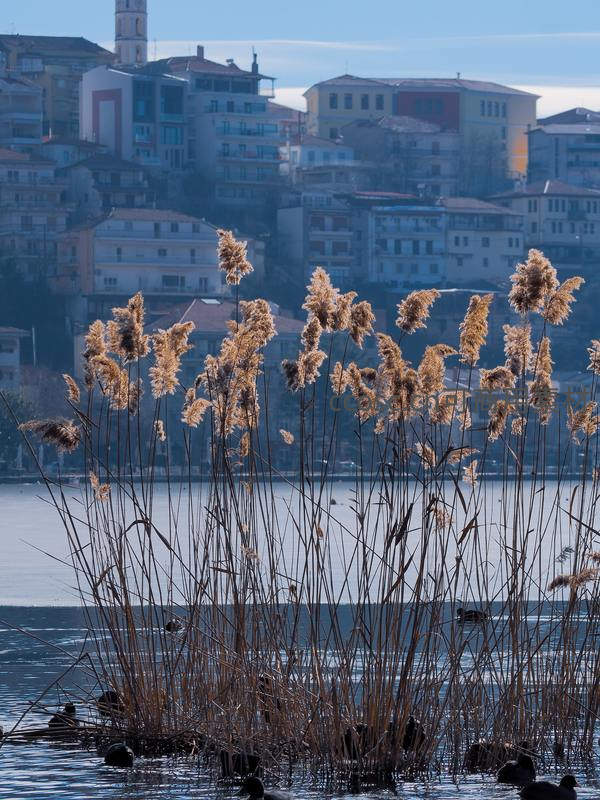 前景的芦苇随风轻摆,身后是依山而建的城市建筑群,平静的湖面倒映着蓝天与楼宇,构成一幅人与自然和谐共处的画面。