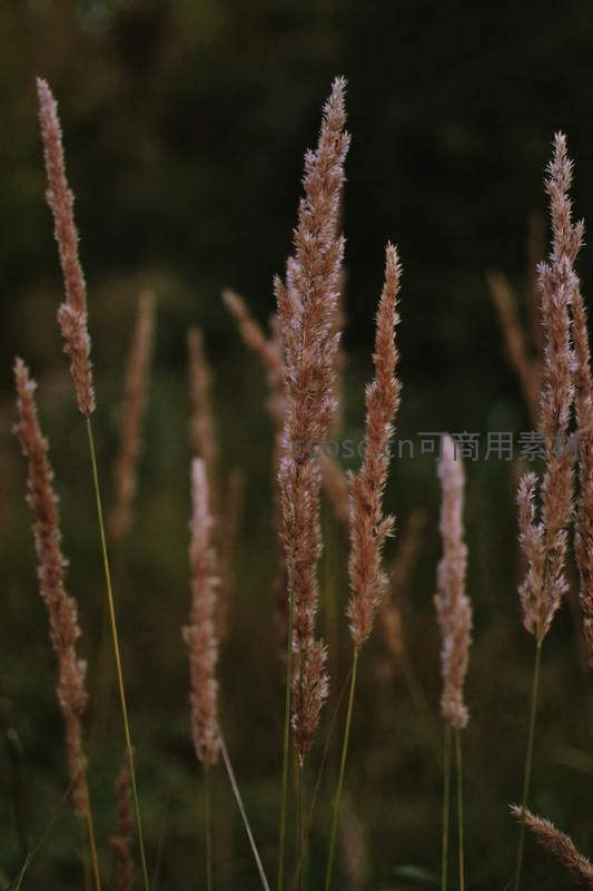 在昏暗的暮色背景下,几株高挑的草穗被柔和光线照亮,纤细的花序清晰可见,展现出植物在黄昏时分独特的生命力与美感。