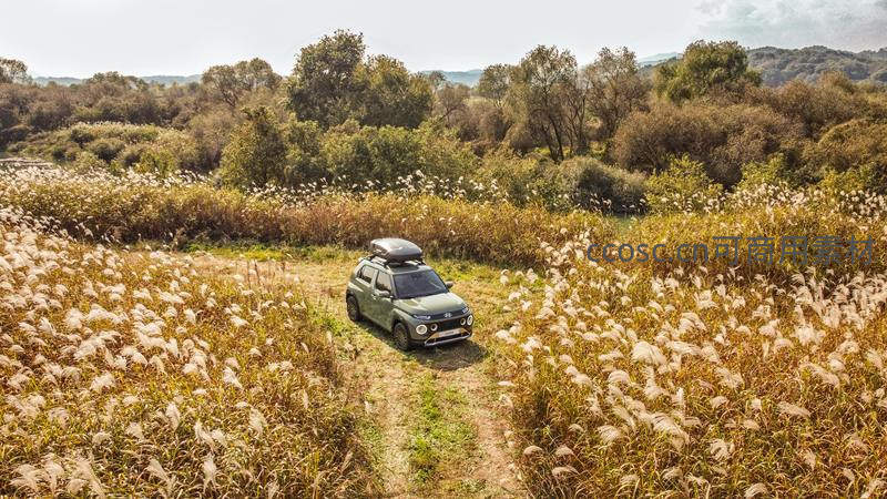 一辆绿色越野车行驶在开满白色芦花的乡间小径上,四周是金黄的芦苇与葱郁树林,展现了自由驰骋于大自然怀抱中的野趣与活力。