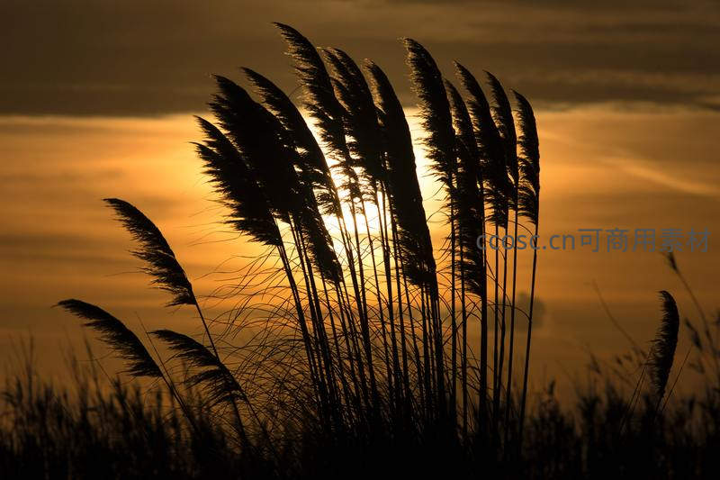 夕阳西下,金色的余晖穿透芦苇丛,形成优美的黑色剪影,与橙黄渐变的天空构成一幅诗意画卷。