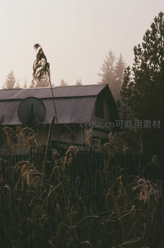 晨雾笼罩着乡间小屋,前景的枯黄芦苇随风轻摆,远处松林若隐若现,充满诗意。