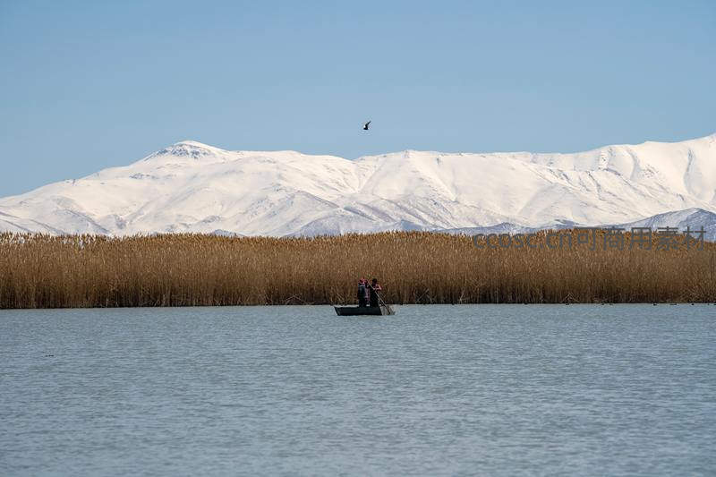 辽阔湖面漂浮一叶扁舟,背景是连绵雪峰和芦苇荡,一只飞鸟掠过,画面空灵壮阔。
