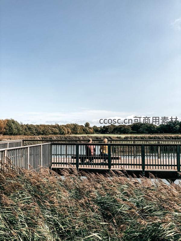 一对情侣坐在木质观景台上,背对镜头欣赏前方的芦苇荡与开阔湖景,享受悠闲午后时光。