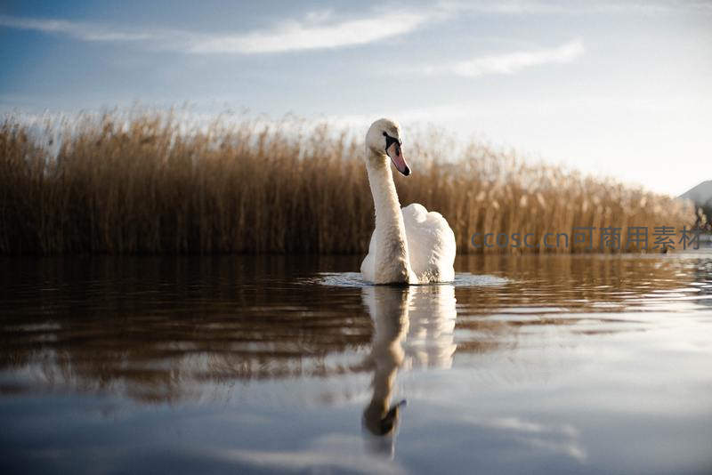 一只洁白的天鹅悠然浮于平静湖面,其修长的脖颈与身影在水中形成完美倒影,背景是金黄芦苇,静谧而唯美。