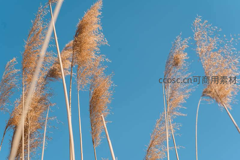 仰拍视角下的金色芦苇穗,蓝天为幕