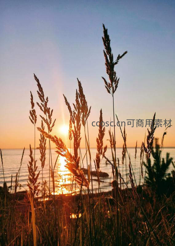 落日余晖穿过前景的芦苇,将海面染成金色,营造出温暖而诗意的海滨黄昏氛围。