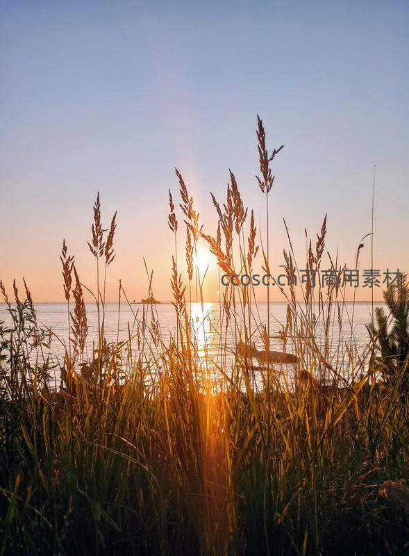 海岸芦苇剪影,夕阳西下金辉洒满海面