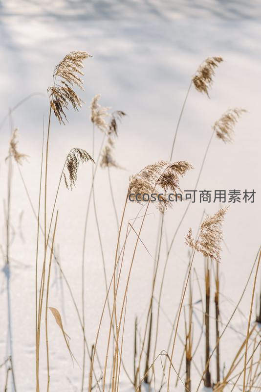 洁白雪地上几株芦苇独立风中,柔韧身姿与纯净背景形成强烈对比,传递冬日静谧之美。
