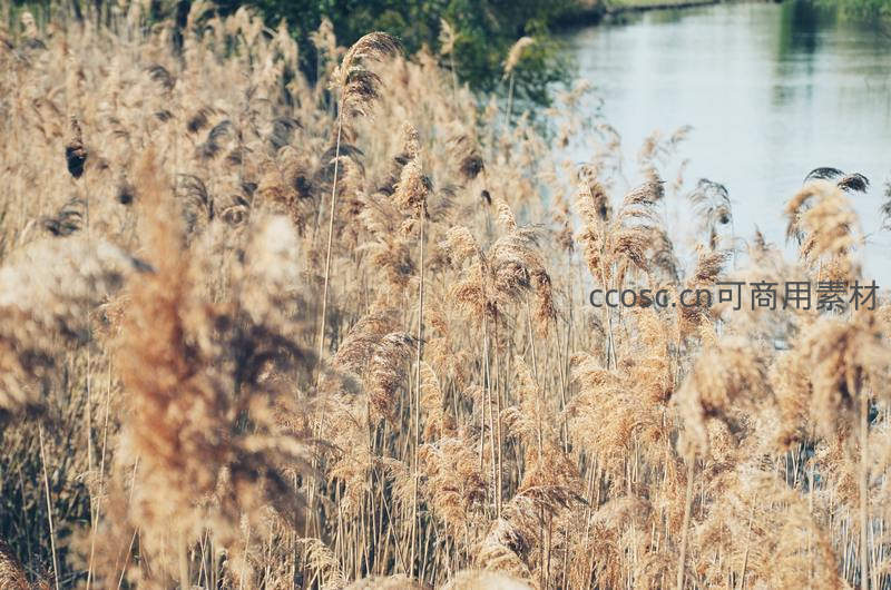 大片金黄色芦苇沿河岸生长,微风吹拂摇曳生姿,构成一幅宁静和谐的水岸画卷。