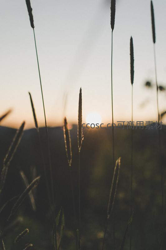 前景是几株细长草叶的黑色剪影,背景是即将落下的橙红色太阳,柔和的光线穿透草叶边缘,营造出温馨而宁静的黄昏意境。