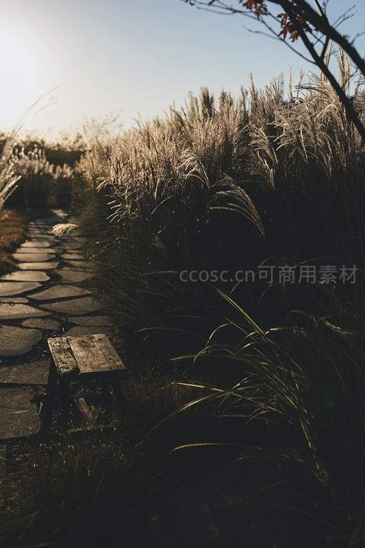 夕阳余晖洒在铺满石板的小径上,两旁茂密的芦苇随风摇曳,一张旧木凳静置路边,营造出诗意宁静的秋日氛围。