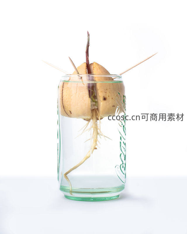一颗土豆用牙签固定在玻璃罐口,下半部分浸入水中,已长出细密的白色根须和嫩芽,是生动有趣的居家科学小实验。