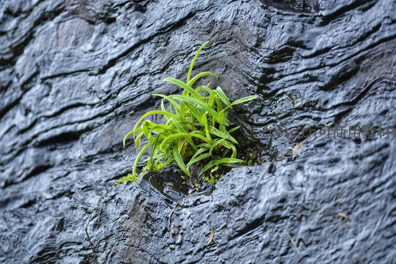 一簇鲜绿的植物从湿润黝黑的岩石缝隙中顽强生长,展现着生命在逆境中的坚韧与活力。
