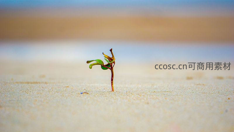 一株纤细的幼苗独自挺立在广阔无垠的沙滩上,背景是模糊的海天一线,象征着希望与坚持。