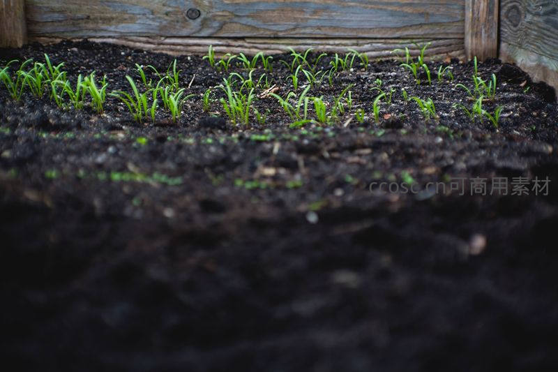在肥沃的黑色土壤菜畦里,一排排整齐的青翠幼苗正茁壮成长,预示着一个丰饶的季节即将来临。