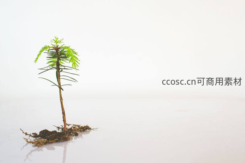 一株纤细的幼苗带着根部泥土,独自伫立在纯净的白色背景前,象征着生命初始的坚韧与希望。