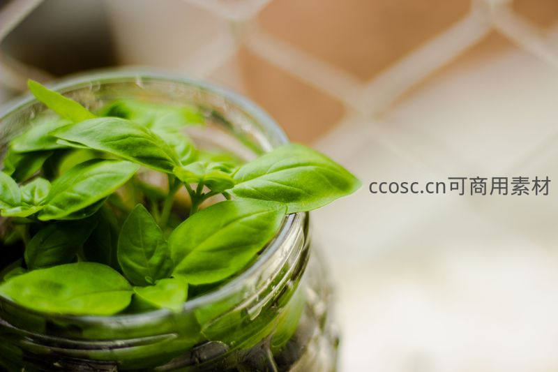 新鲜翠绿的罗勒叶在透明玻璃罐中舒展,背景是温暖的厨房瓷砖,散发着清新自然的香气和生活气息。