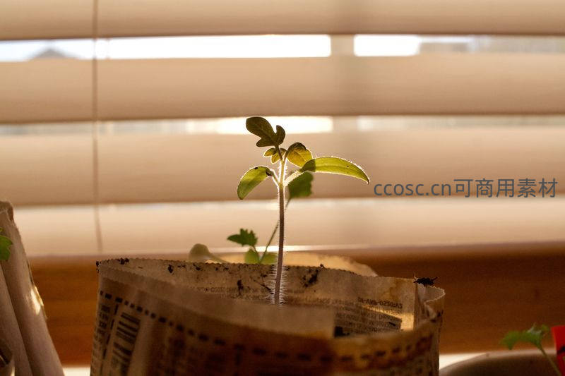 一株番茄幼苗在报纸制成的纸杯中茁壮成长,柔和的阳光透过百叶窗洒下,营造出宁静温馨的居家氛围。