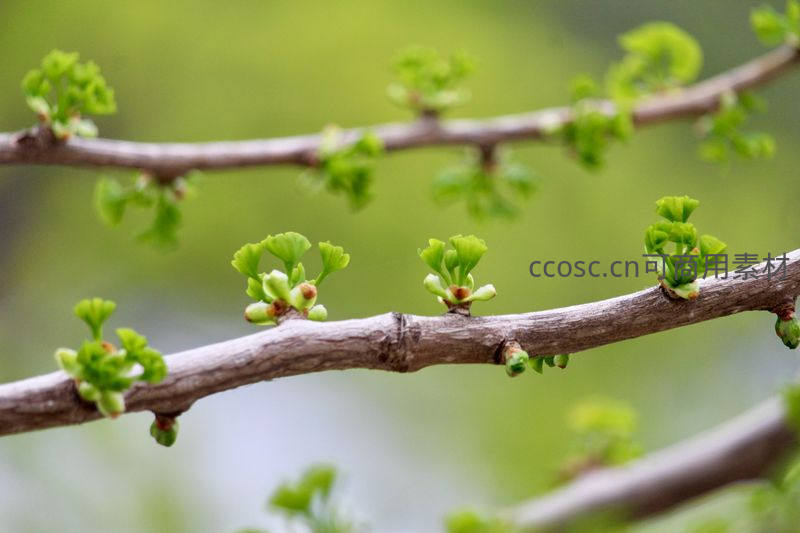 特写镜头捕捉到银杏树枝上刚刚萌发的扇形嫩芽,在柔和的绿色背景映衬下,充满了春天的活力与清新感。