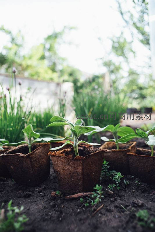 几株翠绿的幼苗整齐地排列在可降解的育苗盆中,背景是模糊的庭院花园,充满了田园气息与希望。