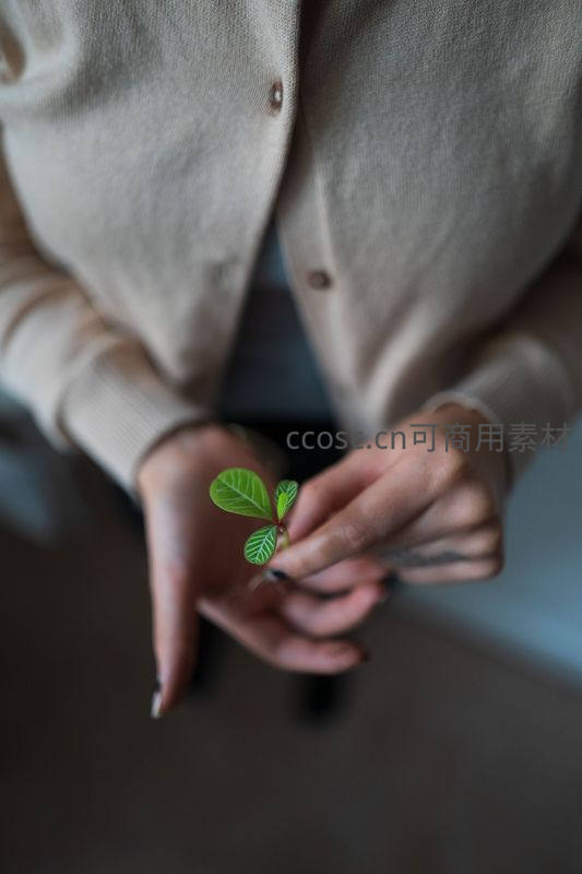 一位穿着米色开衫的人将一株娇小的绿叶幼苗轻轻托在掌心,动作温柔,传递出对新生命的珍视与美好期许。