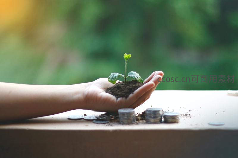 一只手托着带土的幼苗,旁边散落着几叠硬币,巧妙结合了自然生长与财富积累的概念,象征稳健投资与未来收益。