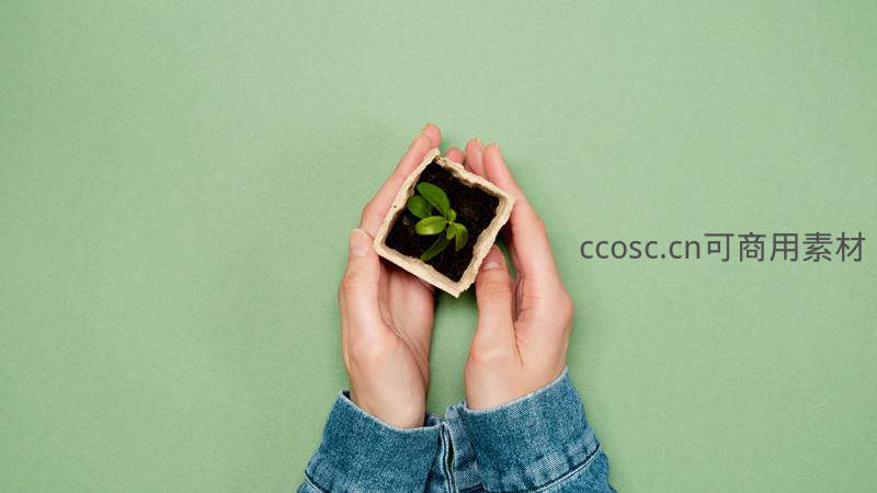 一双温柔的手捧着方形纸盆中的小绿芽,背景为纯绿色,突出新生力量与对自然的珍视与培育之情。