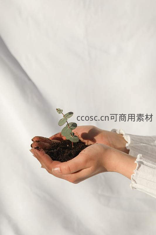 一位穿着白色衣袖的女性双手捧着带着泥土的幼苗,背景纯净洁白,寓意环保与生命的美好开端。