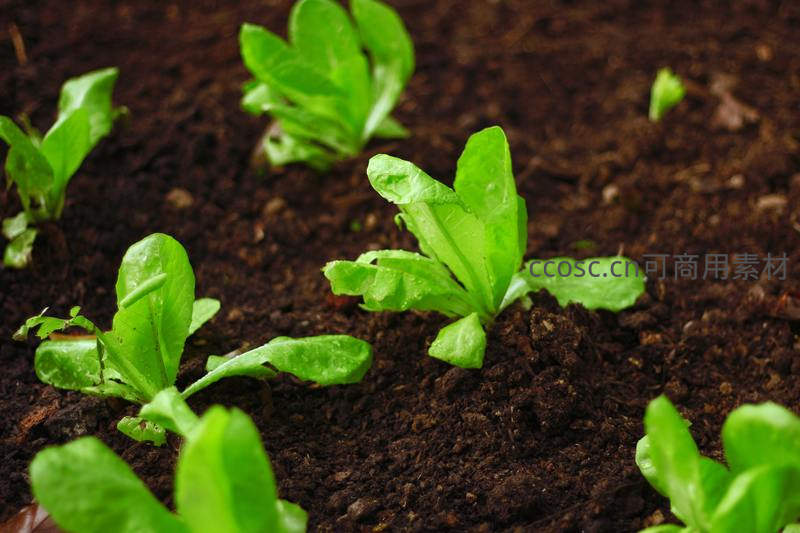 几株翠绿的生菜幼苗从湿润肥沃的土壤中探出头来,叶片上还挂着晶莹水珠,展现出自然生长的活力与健康。