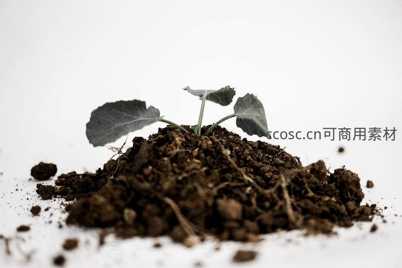 一小堆深褐色土壤置于纯白背景中央,其上萌发的幼苗清晰可见根系,构图简洁,寓意生命起源与纯净自然。