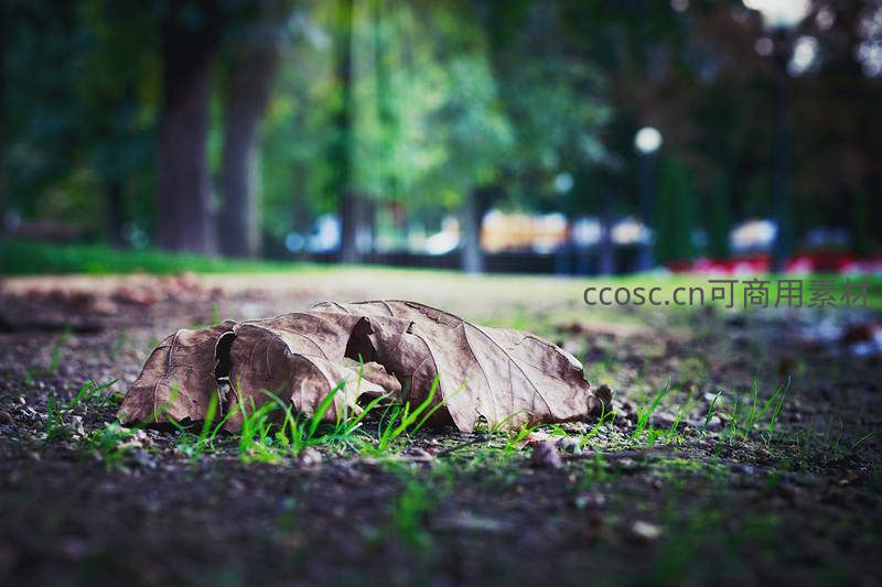 一片干枯的落叶静静躺在湿润泥土上,边缘钻出几簇鲜绿小草,远处是模糊的林荫道,展现自然更替与生命轮回。