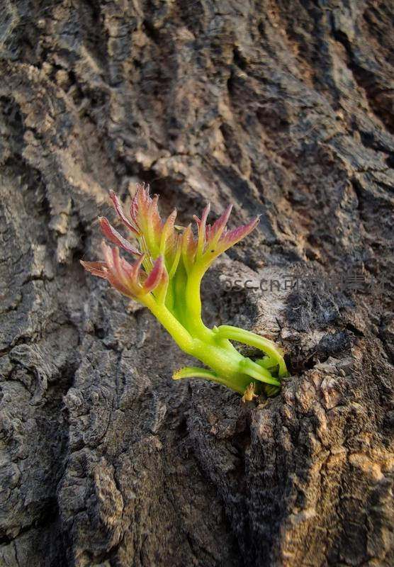 粗糙树皮裂缝中,顽强新芽破壁而出