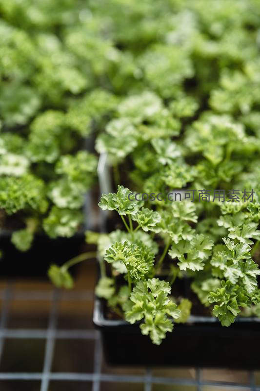 一排排整齐的香菜幼苗在黑色育苗盘中茁壮成长,叶片翠绿卷曲,等待着被移栽到更广阔的天地。