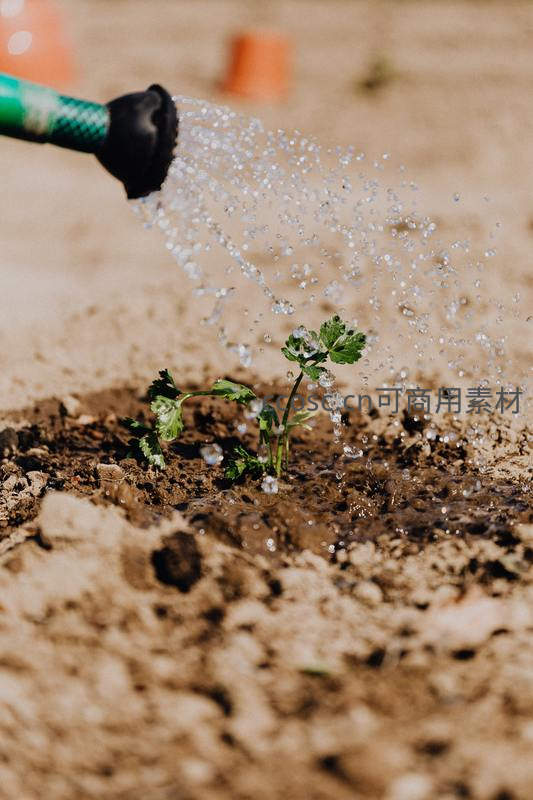 水枪浇灌幼苗,水珠飞溅瞬间