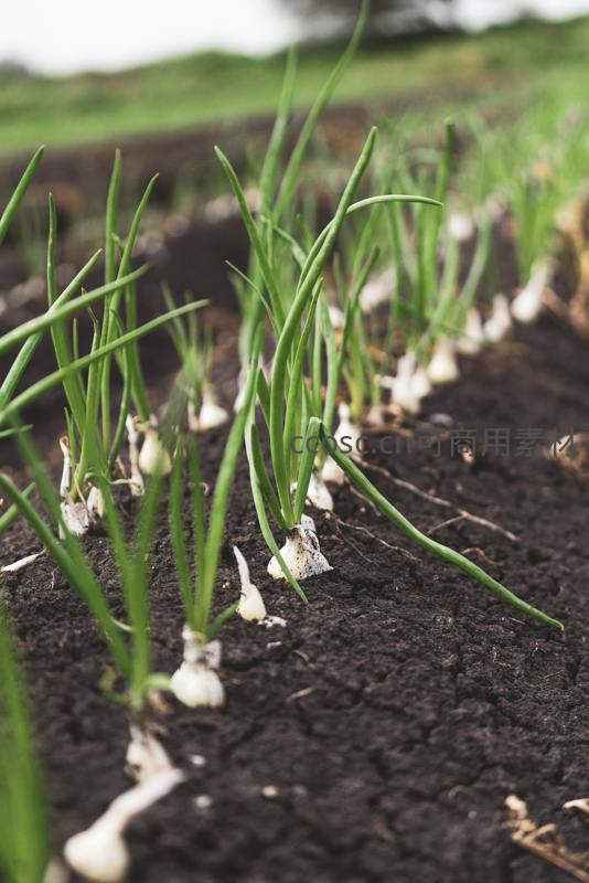 一排排翠绿的葱苗从肥沃的黑色土壤中挺拔而出,根部洁白,展现出蓬勃的田园生机。