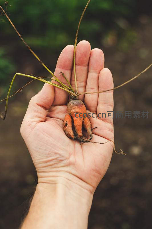 一只手掌托着一根形态奇特的胡萝卜,根茎上还带着泥土和绿叶,展现了自然种植的真实与质朴。